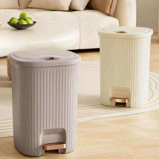 Une poubelle beige se fond dans le décor tout en restant fonctionnelle.